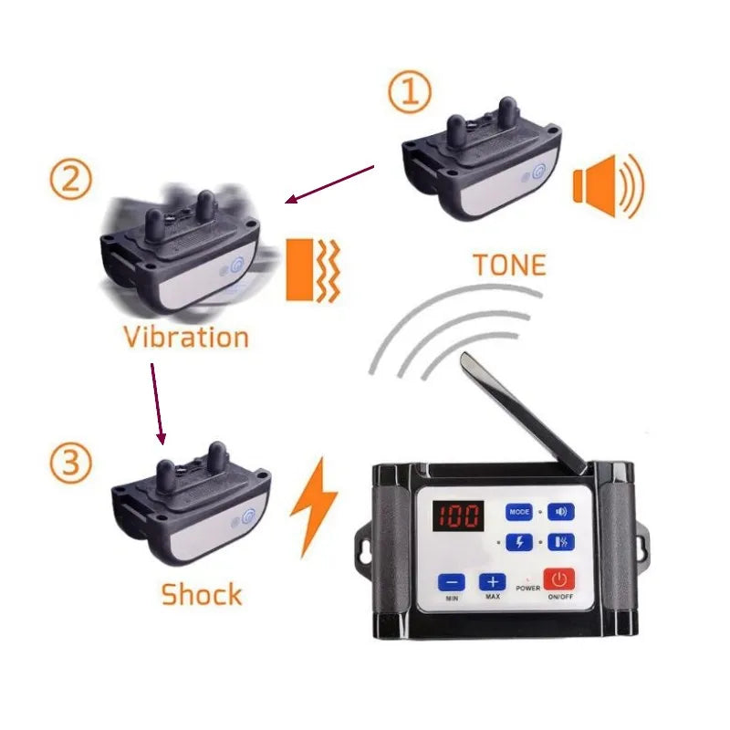 Train and protect your furry friend with this versatile 2-in-1 wireless dog collar. Ideal for outdoor use, it combines fence containment and training functionality to keep your pet safe and well-behaved.